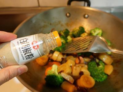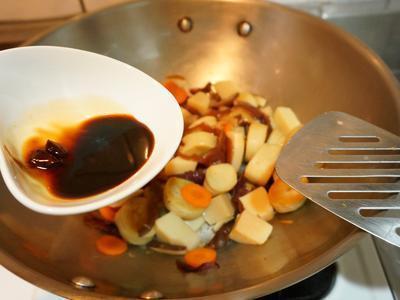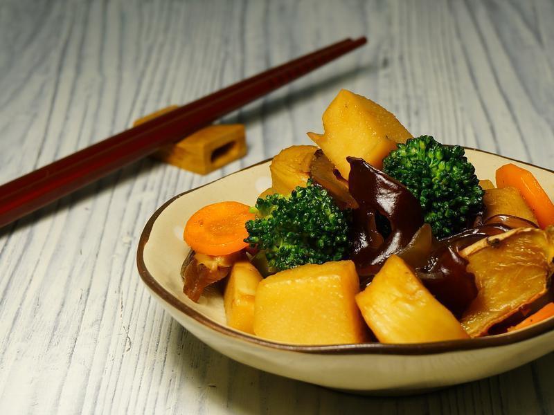 麵腸2條. 花椰菜1顆. 黑木耳1大朵. 沙拉筍3個. 薑片3片. 水100ml. 紅蘿蔔適量. 香菇適量. 素蠔油2茶匙. 醬油2茶匙. 醬油2茶匙. 紅糖1/2茶匙. 胡椒粉少許。 |